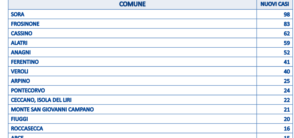 E’ Sora a far registrare il picco con 98 casi; 83 a Frosinone, 62 a Cassino, 59 ad Alatri, 52 ad Anagni, 41 a Ferentino.