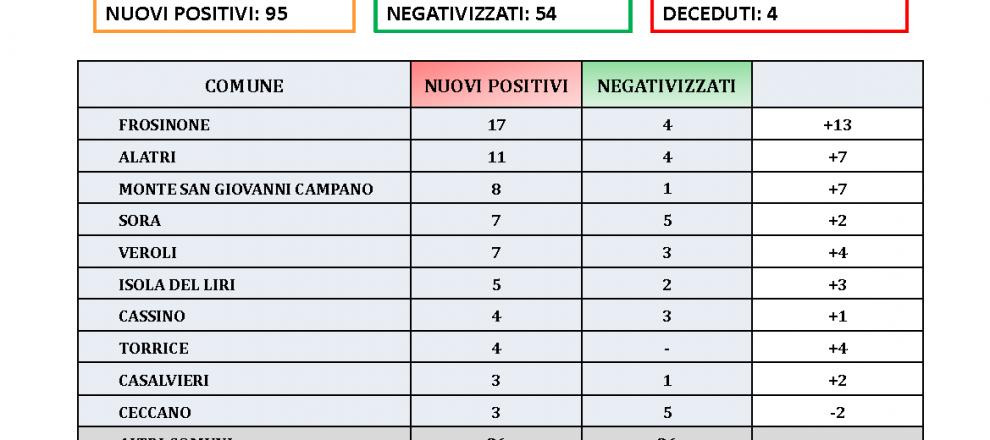 A far registrare il piuù alto numero di contagi è Frosinone con 17, segure Alatri con 11, 8 a Monte San Giovanni Campano, 7 a Sora, Veroli, 5 ad Isola del Liri, 4 a Cassino, Torrice, 3 a Ceccano e Casalvieri, e poi altri 26 positivi in altri comuni d ella provincia di Frosinone.