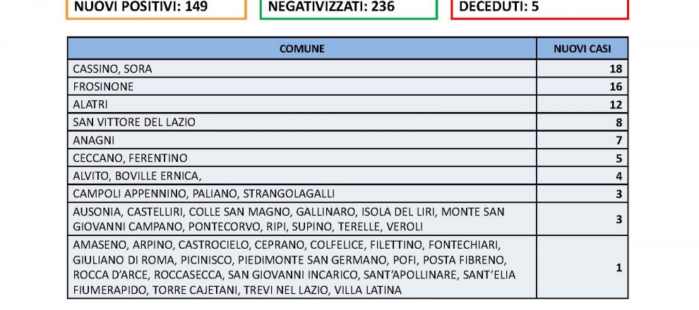 Ancora alto il numero delle vittime Covid in provincia di Frosinone in 24 ore. Sono cinque i decessi comunicati dalla Asl, si tratta di un 50enne di Arnara, un 59enne residente a Frosinone, un uomo di 91 anni residente a Veroli, un uomo di 67 anni di Ferentino e una donna di 78 anni di Isola del Liri. I nuovi positivi sono 149 su un totale di 2437 tamponi effettuati, con il tasso di positività che scende al 6,11%. Tra i comuni resta Cassino quello con più casi, 18 a pari merito con Sora, poi Frosinone con 16, Alatri 12, San Vittore del Lazio 8, Anagni 7, Ceccano e Ferentino con 5. Buono il dato dei guariti che sono 236.