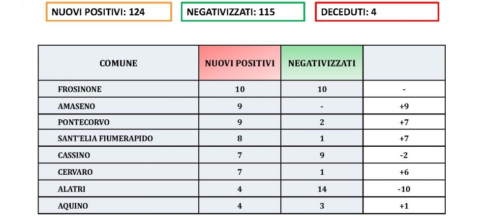 Sono 124 i nuovi positivi al Covid scoperti nelle ultime 24 ore dalla Asl di Frosinone, il tutto su un totale di 1004 tamponi effettuati. L’indice di positività si conferma al di sopra del 10% attestandosi al 12,3%. Quattro i decessi e si tratta di una donna di 93 anni residente a Trevi nel Lazio, un uomo di 70 anni residente a Pofi, un uomo di 83 anni residente a Ceprano e un uomo di 67 anni residente a Veroli.