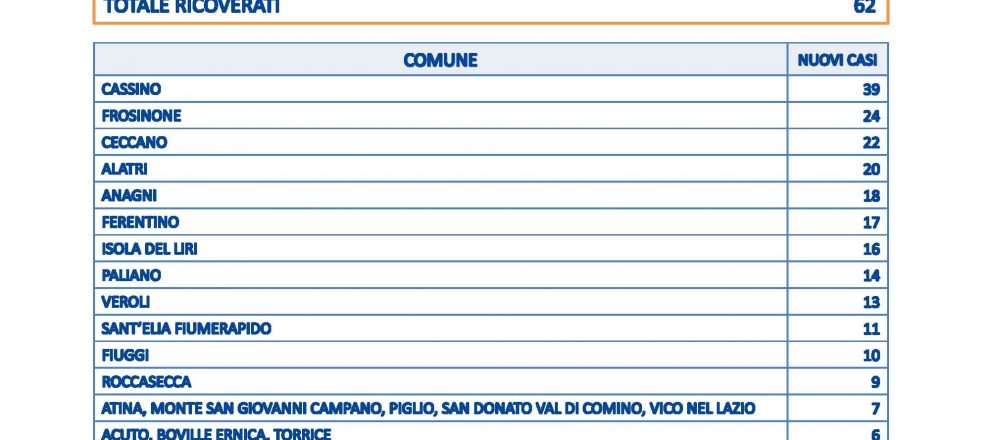 I nuovi positivi al Covid in provincia di Frosinone sono 379, superati dal numero odierno dei guariti che sono 417. Il tasso di positività è al 15,59%. Un decesso è stato registrato, si tratta di un 82enne residente ad Alatri. I ricoverati positivi al Covid allo Spaziani sono 62. E’ Cassino la città con più casi, 39, seguita da Frosinone a 24 e Ceccano a 22. Ad Alatri 20 positivi, 18 ad Anagni, 17 a Ferentino e 16 ad Isola del Liri. Con 14 casi Paliano, Veroli 13, Sant’Elia Fiumerapido 11 e Fiuggi 10. I comuni toccati dai nuovi casi sono 63.