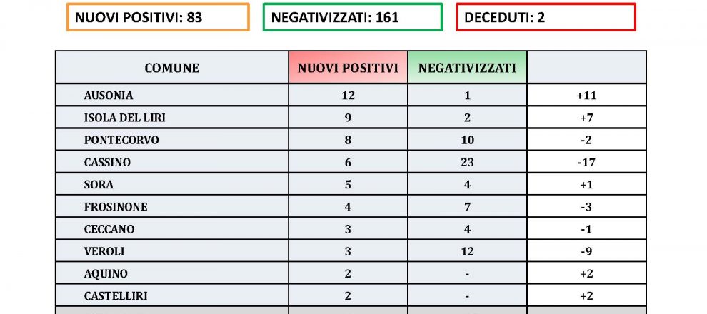 Sono 83 i nuovi positivi al Covid in provincia di Frosinone nelle ultime 24 ore, su un totale di 988 tamponi effettuati, con un indice di positività pari all’8,4%. Due le vittime censite dalla Asl, si tratta di un 68enne di Cassino e di una 89enne di Anagni. I guariti sono il doppio dei nuovi contagiati, con un numero di 161 unità. A guidare la classifica dei contagi c’è il comune di Ausonia con 12 nuovi positivi, seguito da Isola del Liri con 9, Pontecorvo con 8 e Cassino con 6. Poi Sora con 5 casi, Frosinone con 4, Ceccano e Veroli 3; Aquino e Castelliri 2. Negli altri comuni 29 casi.