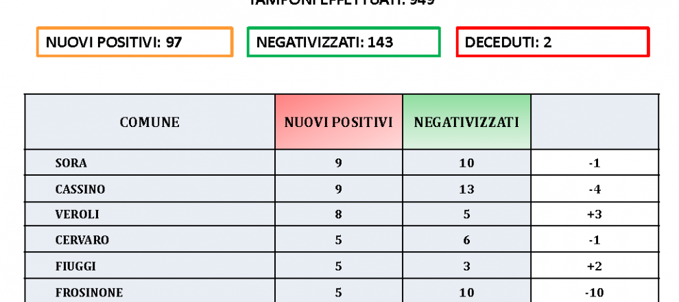 Sono 97 i nuovi positivi al covid 19 accertati in provincia di Frosinone nelle ultime 24 ore a fronte dei 949 tamponi eseguiti. Due i decessi: si tratta di un uomo di 91 anni residente a Pontecorvo e una donna di 53 anni residente a Boville Ernica.