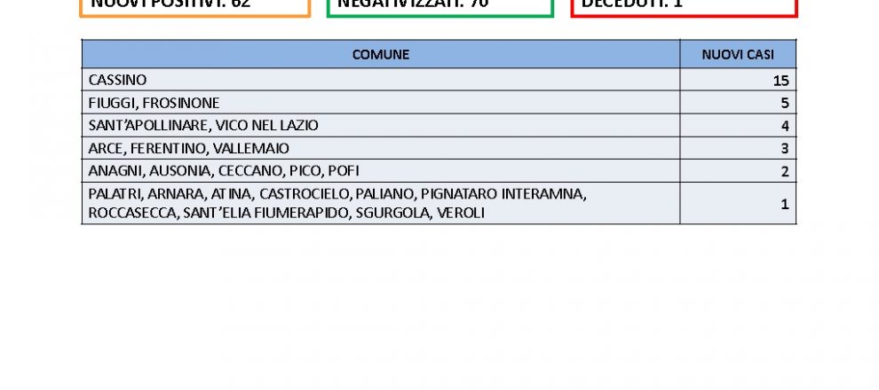 Resta basso il numero dei contagi in provincia di Frosinone. 64 i nuovi casi emersi da 1730 tamponi processati, con un rapporto che si attesta al 3.5%. 70 i guariti. C’è una vittima: si tratta di una donna di 92 anni di Giuliano di Roma. Andando alla mappa dei contagi: Cassino in testa con 15 casi, Fiuggi e Frosinone seguono con 5. 4 i positivi a Sant’Apollinare e Vico nel Lazio, 3 ad Arce, Ferentino e Vallemaio.