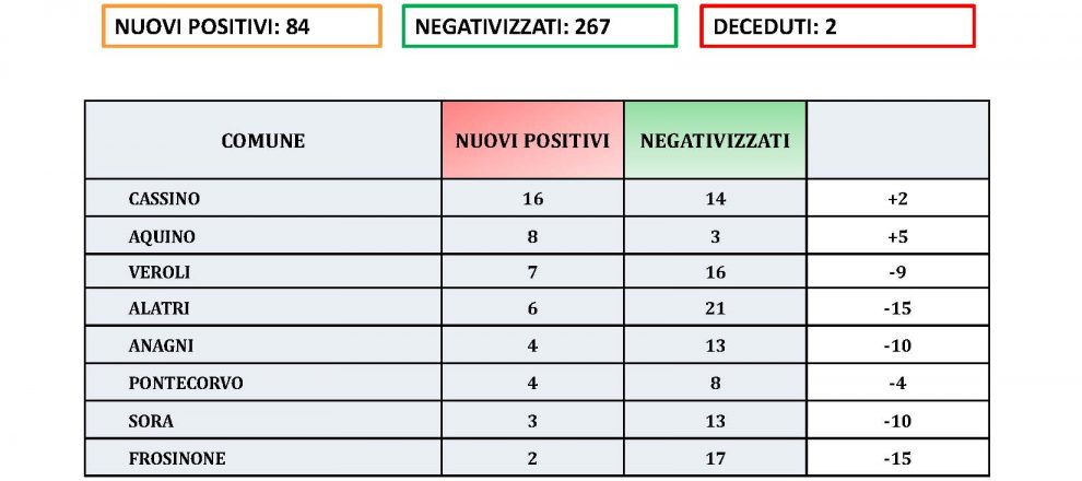 Sono 83 i nuovi positivi nelle ultime 24 ore in provincia di Frosinone, a fronte di un numero comunque importante di tamponi pari a 1357. La prevalenza di casi positivi sui tamponi totali scende bruscamente al 6,19%. A guidare la classifica dei nuovi casi Cassino con 16 nuovi positivi, Aquino con 8 e Veroli con 7. L’altro ottimo dato riguarda le guarigioni, che sono più del triplo rispetto alle nuove infezioni registrate. In riferimento ai tre decessi si tratta di un uomo di 91 anni residente a San Giorgio a Liri e una donna di 92 anni residente a Fontana Liri.