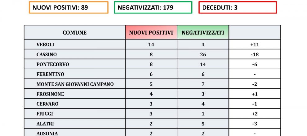 Sono 89 i casi positivi al Covid su 1217 tamponi realizzati nelle ultime 24 ore dalla Asl di Frosinone. L’indice di prevalenza dei test positivi sul totale è stabile rispetto a ieri al 7,3%. Tre le vittime, si tratta di un uomo di 88 anni residente a Pontecorvo, una donna di 77 anni residente a Frosinone e un donna di 99 anni residente a Casalattico. I guariti sono 179, praticamente il doppio dei nuovi casi. Veroli il comune con più positività registrate, 14, seguito da Cassino e Pontecorvo con 8, Ferentino con 6 e Monte San Giovanni Campano con 5.