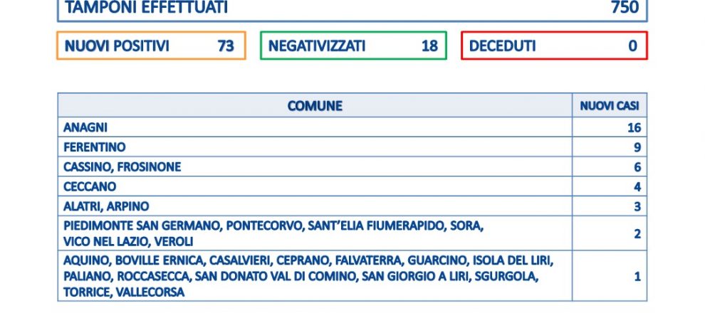 Il trend ormai è in salita e i numeri continuano ad essere imponenti: 73 i nuovi positivi emersi dal bollettino odierno della Asl di Frosinone, nulla a che vedere con le cifre, basse, cui ci eravamo abituati nelle settimane passate. I casi sono emersi da 750 tamponi processati, con un rapporto molto alto, al 9.7%.