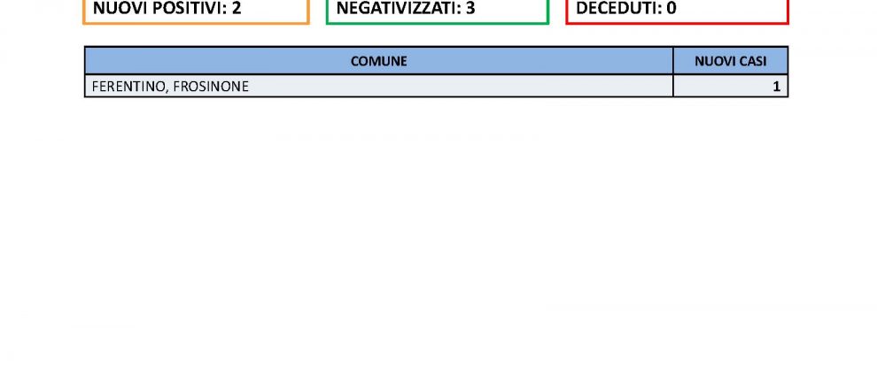 Sono due i nuovi casi di positività al Covid emersi in Ciociaria nelle ultime 24 ore. A renderlo noto è la Asl nel consueto bollettino in cui, a fronte di 247 tamponi effettuati, sono risultate due nuove positività di persone residenti a Frosinone e Ferentino. Tre i guariti e nessun decesso.