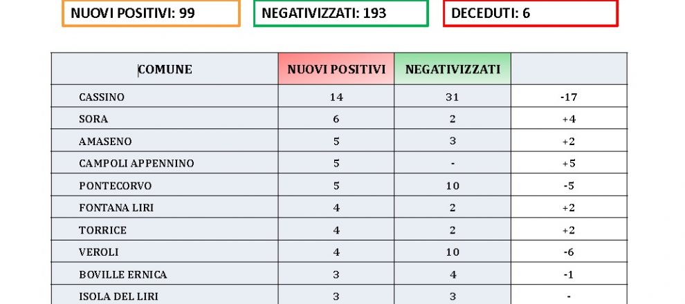 Migliora la situazione in provincia di Frosinone, sul fronte dei nuovi contagi, ma è stata una giornata drammatica per il numero dei decessi: sono 99 i positivi emersi da 1157 tamponi processati, con un rapporto tra casi e test che scende all’8.5%. Alto il numero dei guariti: 193.