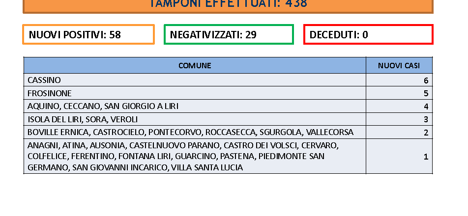 Sono 28 i comuni coinvolti dal contagio in base ai numeri forniti dal bollettino di ferragosto diramato dalla Asl di Frosinone. 438 i tamponi processati che hanno accertato 58 nuove positività in ciociaria.