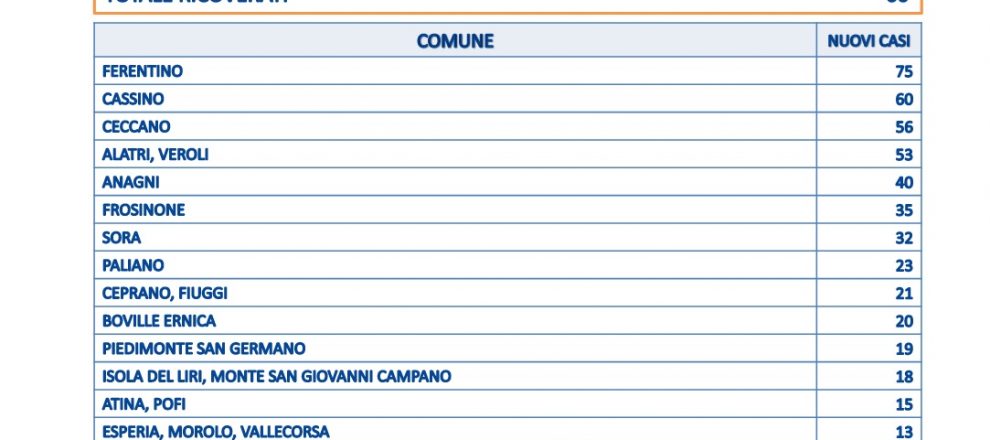 Quasi 1200 guariti, ma anche 874 nuovi casi. Sono i numeri del bollettino della Asl di Frosinone: positivi che emergono da un totale di poco più di cinquemila tamponi processati. Ferentino è la città che registra il numero maggiore dei casi, sono 75. 60 i contagi a Cassino, 56 a Ceccano, 53 ad Alatri e Veroli. Più giù troviamoAnagni con 40 positivi ed il capoluogo con 35.
