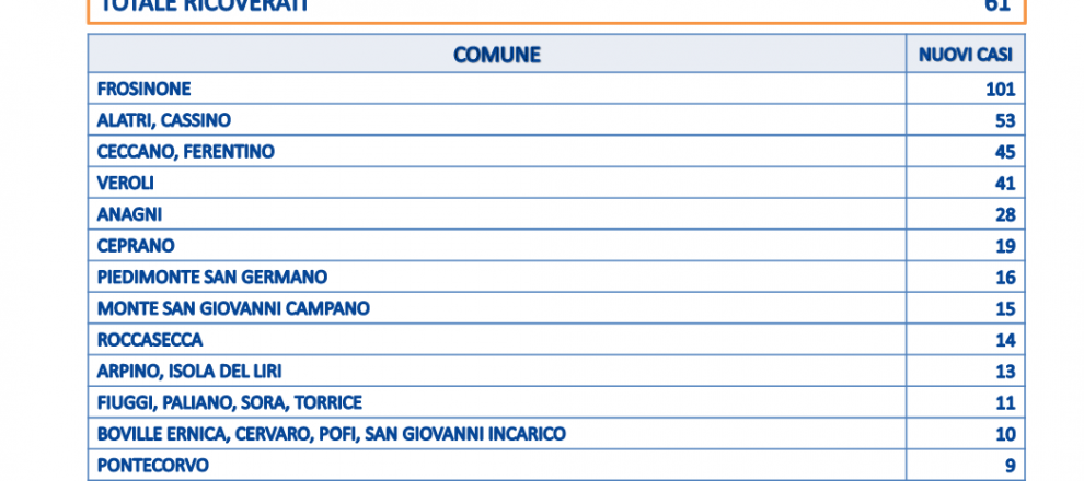Frosinone è la città con il più alto numero dei contagi: sono 101. 53 i positivi ad Alatri e Cassino, 45 a Ceccano e Ferentino. 41 a Veroli. Ad Anagni i nuovi positivi sono 28, mentre a Ceprano si registrano 19 nuovi contagi.