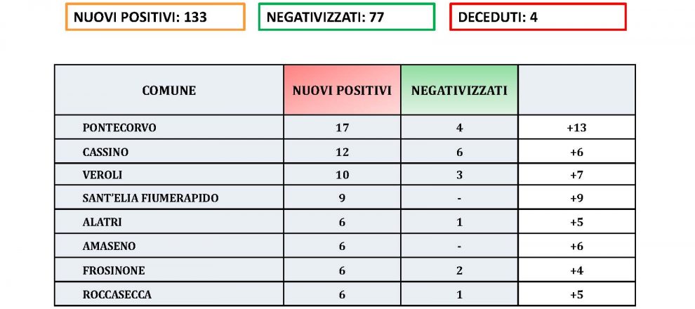 Sono 133 i nuovi positivi al Covid nelle ultime 24 ore in Ciociaria. I casi sono scaturiti dagli 832 tamponi effettuati e portano quindi ad una prevalenza di positivi rispetto al totale pari a circa il 16%.
