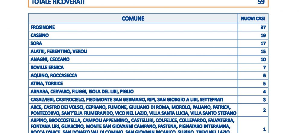 Sono 251 i nuovi positivi al Covid in Ciociaria con la morte anche di un 73enne con pregresse patologie. I casi, emersi a fronte di 2376 tamponi, rivelano un tasso di positività pari al 10,5%. I ricoverati con positività al Covid sono 59, mentre i guariti sono 403. Il numero maggiore di casi a Frosinone, che ne conta 37, poi Cassino con 19, Sora 17, Alatri, Ferentino e Veroli 15, Anagni e Ceccano 10, Boville Ernica 7, Aquino e Roccasecca 6. In totale sono coinvolti dal contagio 56 comuni.