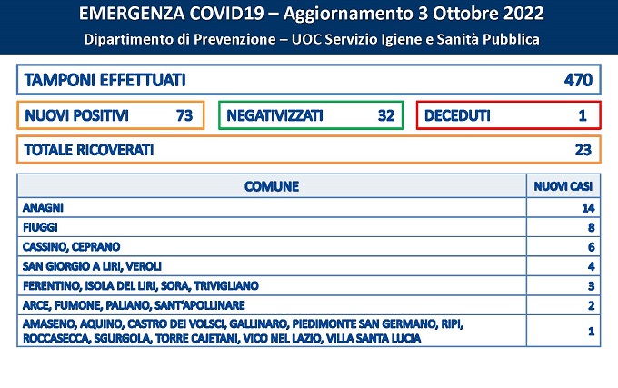 Come ogni lunedì basso il numero di casi Covid in Ciociaria. Per l’esattezza sono 73, emersi su 470 tamponi effettuati, con un tasso di positività al 15,53%. Si conta anche una vittima, si tratta di un 87enne residente a Ceccano. I ricoverati con positività al Covid sono 23, mentre i guariti 32. E’ Anagni la città con più casi, a 14, al secondo posto Fiuggi con 8, poi Cassino e Ceprano con 6 casi, San Giorgio a Liri e Veroli con 4. Da tre ad un caso altri 19 comuni.