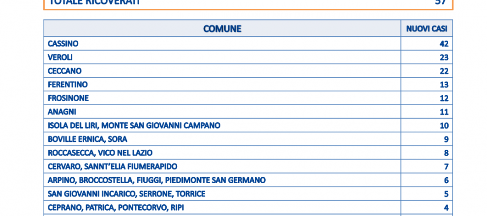 Sono 322 i nuovi casi positivi in provincia di Frosinone. Li ha comunicati la Asl nell’ultimo bollettino: si tratta di contagi emersi su un totale di 1814 tamponi processari. Non ci sono vittime ed i negativizzati sono 493. C’è Cassino in testa nella mappa dei casi: 42 i positivi, 23 a Veroli, 22 a Ceccano e 13 a Ferentino.