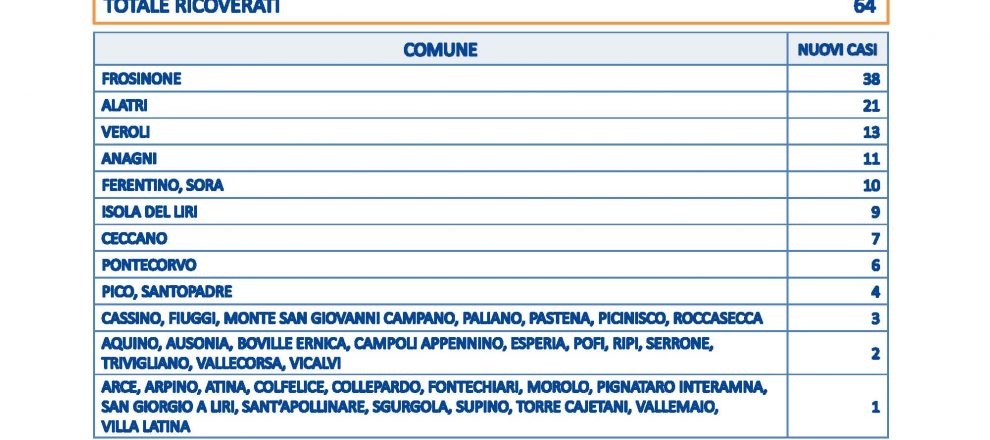 Sono 192 i casi Covid registrati in Ciociaria nelle ultime 24 ore a fronte di 895 tamponi effettuati. Il tasso di positività si attesta al 21,4%, quindi stabile rispetto agli altri giorni quando i tamponi, ed i casi, erano molti di più. Tornano a salire i ricoverati, che sono 64, mentre i guariti sono 122. Non si contano vittime. La città che registra più positivi è Frosinone a quota 38, poi Alatri a 21, Veroli a 13. Ad Anagni i nuovi positivi sono 11, mentre a Sora e Ferentino 10, Isola del Liri ne conta 9 e Ceccano 7. Da sei ad un caso ci sono 36 comuni coinvolti.