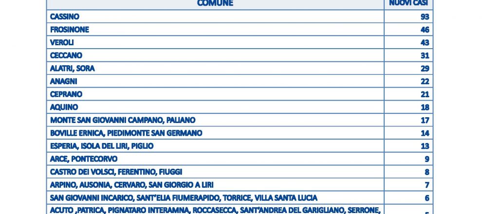 Continua a scendere il tasso di positività in provincia di Frosinone, dove oggi a fronte di 6064 tamponi si registrano 719 nuovi casi Covid, con l’indice pari all’11,85%. Si contano purtroppo tre decessi: una donna di 83 anni di Alatri, un uomo di 76 anni di Sant’Elia Fiumerapido ed un 95enne di Paliano. I ricoveri sono stabili a 82, mentre sono 462 i guariti. E’ Cassino a contare il maggior numero di casi con 93 positivi, doppiando Frosinone secondo a 46, seguito da Veroli a 43. A Ceccano i casi sono 31, mentre ad Alatri e Sora 29, Anagni 22, Ceprano 21 ed Aquino 18. A Paliano e Monte San Giovanni Campano 17 casi, 14 a Boville Ernica e Piedimonte San Germano, sono 13 ad Esperia, Isola del Liri e Piglio. Da 9 a 3 casi ci sono 35 comuni, mentre sono 23 con uno e due casi e li elenchiamo di seguito: