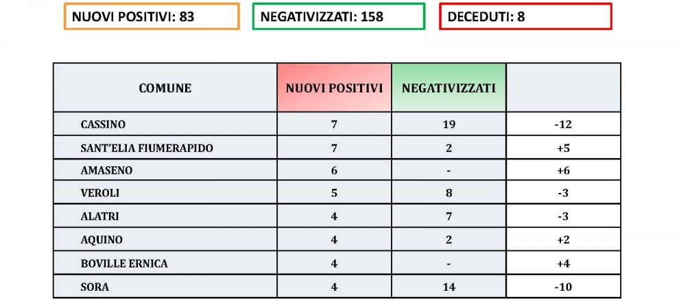 In riferimento ai decessi: si tratta di un uomo di 64 anni residente a Sezze, una donna di 89 di Ceprano, un uomo di 76 anni di Torrice, un 82enne di Pontecorvo, una donna di 80 anni di Roma, una 50enne di Pignataro Interamna, una donna di 85 anni residente a Roccasecca e una donna di 91 anni residente a Frosinone.