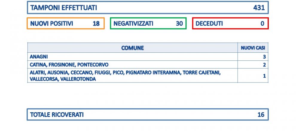 Sono 18 i nuovi casi positivi al Covid in provincia di Frosinone nelle ultime 24 ore. Sono emersi da 431 tamponi processati, con un rapporto al 4.1%. 3 i contagi ad Anagni, 2 ad Atina, Frosinone e e Pontecorvo. 1 a Alatri, Ausonia, Ceccano, Fiuggi, Pico, Pignataro, Torre Cajetani, Vallecorsa e Vallerotonda. Aumenta il numero delle persone ricoverate: erano 12, sono diventate 16, con 4 ricoveri nelle ultime 24 ore.
