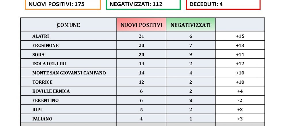 Un nuovo balzo: 175 i casi registrati nelle ultime 24 ore in provincia di Frosinone, su un totale di 1199 tamponi eseguiti. Il rapporto è alto, al 14%. Sono 112 i negativizzati e 4 i decessi: due uomini, uno di 73 anni di Ceprano ed un 90enne di Pico, e due donne, una 85enne di Cassino ed una 74enne di Pontecorvo. Andando alla mappa dei contagi: spicca Alatri, dove i nuovi casi sono 21. Frosinone e Sora 20, 14 ad Isola del Liri e Monte San Giovanni Campano, 12 a Torrice.