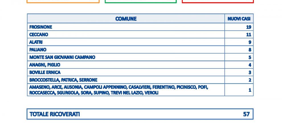 Effetto domenica, si fa per dire, sui positivi in provincia di Frosinone. I nuovi casi Covid sono 79 a fronte di 1123 tamponi effettuati: il tasso di positività si attesta al 7%. I ricoverati sono 57, ovvero 26 in più rispetto a domenica quando erano 31. I guariti 39 e nessun decesso è stato registrato. Frosinone la città con più casi, 19, mentre al secondo posto c’è Ceccano con 11 casi, Alatri con 9 e Paliano 8. Poi Monte San Giovanni Campano con 5, Anagni e Piglio con 4, Boville Ernica con 3, Broccostella, Patrica e Serrone con 2. Sono 14 i comuni che contano un caso.