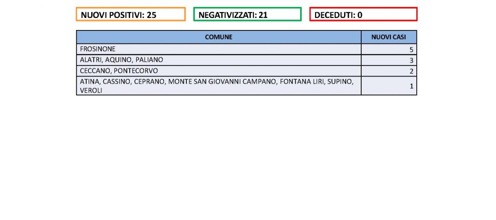 Sono 25 i nuovi casi positivi al Covid in provincia di Frosinone. Dopo i 64 di mercoledì ed i 40 di giovedì si conferma la discesa della curva ed anche del tasso di positività: 4,8%, in virtù dei 520 tamponi effettuati. Sono 21 i guariti mentre non si registrano decessi. A Frosinone sono 5 i nuovi casi, mentre con tre casi troviamo Alatri, Aquino e Paliano. I comuni con due casi sono Ceccano e Pontecorvo, mentre con un caso Atina, Cassino, Ceprano, Monte San Giovanni Campano, Fontana Liri, Supino e Veroli.