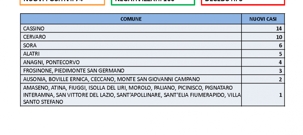E’ Cassino a far registrare il record odierno di contagi con 14. 10 a Cervaro. 6 a Sora. 5 ad Alatri. 4 ad Anagni e Pontecorvo. 3 a Frosinone e Piedimonte S.G.