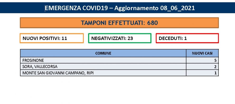 Nelle ultime 24h sono stati effettuati 680 tamponi in provincia di Frosinone, da cui sono emersi 11 nuovi positivi: il rapporto tra casi e test è dell’1,6%. 23 invece le persone che sono guarite.