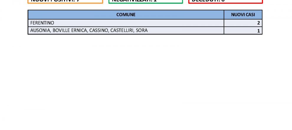 Sono sette i nuovi positivi al Covid registrati in provincia di Frosinone. I tamponi effettuati sono stati 506 con un tasso di positività pari all’1,36%. Zero i decessi, mentre c’è stato un guarito. I nuovi casi sono stati registrati a Ferentino, dove se ne contano due e ad Ausonia, Boville Ernica, Cassino, Castelliri e Sora.