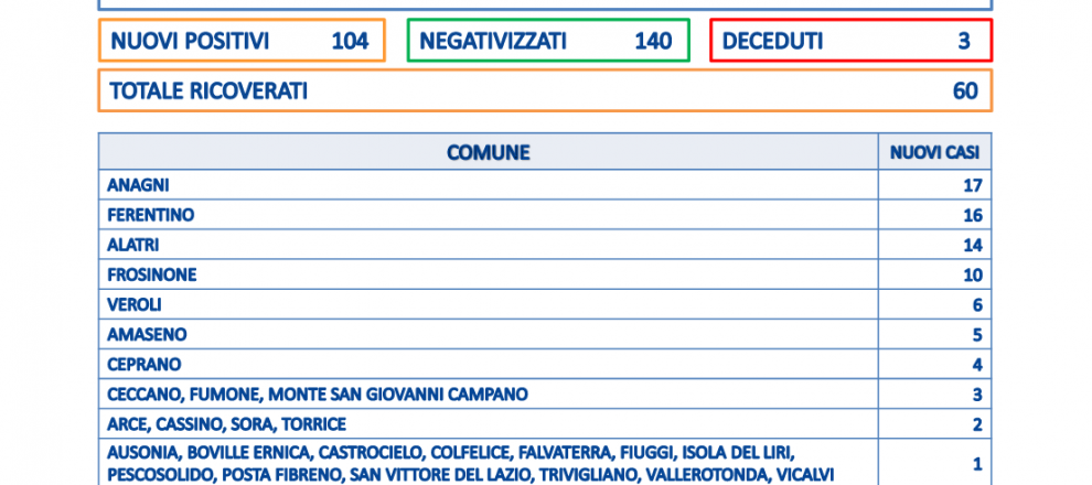 Come ogni lunedì i numeri che riguardano i nuovi positivi sono molto bassi: 104 i casi in provincia di Frosinone, su un totale di soli 375 tamponi processati. Ci sono anche tre decessi: una donna di 86 anni di Ceccano e due uomini, un 86enne di Boville ed un 95enne di San Donato Valcomino. I ricoverati positivi al virus sono 60.