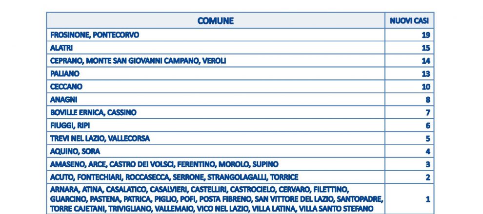 Su circa 2000 tamponi (2059) scendono i casi in Ciociaria, che si attestano a 255. Resta stabile il tasso di positività al 12,3% mentre si contano due decessi: un 86enne di Cassino ed un 90enne di Isola del Liri. Sono Frosinone e Pontecorvo le due città con più casi: 19. E poi ci sono Alatri con 15; a Ceprano, Monte San Giovanni Campano e Veroli 14; Paliano 13, Ceccano 10, ad Anagni 8 e 7 a Boville Ernica e Cassino. Con 6 casi Fiuggi e Ripi, con 5 Trevi nel Lazio e Vallecorsa e con 4 Aquino e Sora. Da tre casi a uno sono 34 i comuni coinvolti, in totale 51. I negativizzati sono 88 ed i ricoverati risalgono di una unità, a 77.