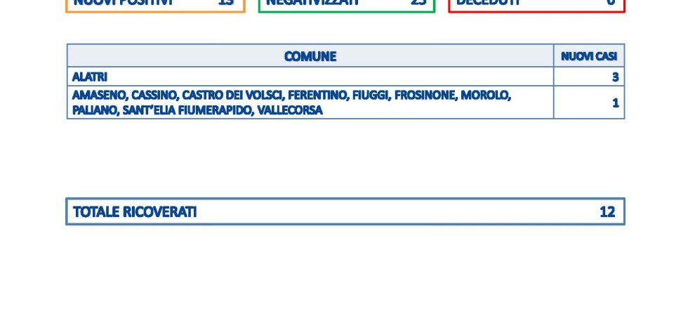 Come ogni lunedì sono molti meno i tamponi processati dalla Asl di Frosinone e di riflesso pochi nuovi casi. I positivi sono 13 a fronte di 291 test, con un tasso di positività pari al 4,46%. I ricoverati restano 12, mentre i negativizzati sono 25. I nuovi casi si registrano ad Alatri dove se ne contano tre, mentre con un caso troviamo Amaseno, Cassino, Castro dei Volsci, Ferentino, Fiuggi, Frosinone, Morolo, Paliano, Sant’Elia Fiumerapido e Vallecorsa.