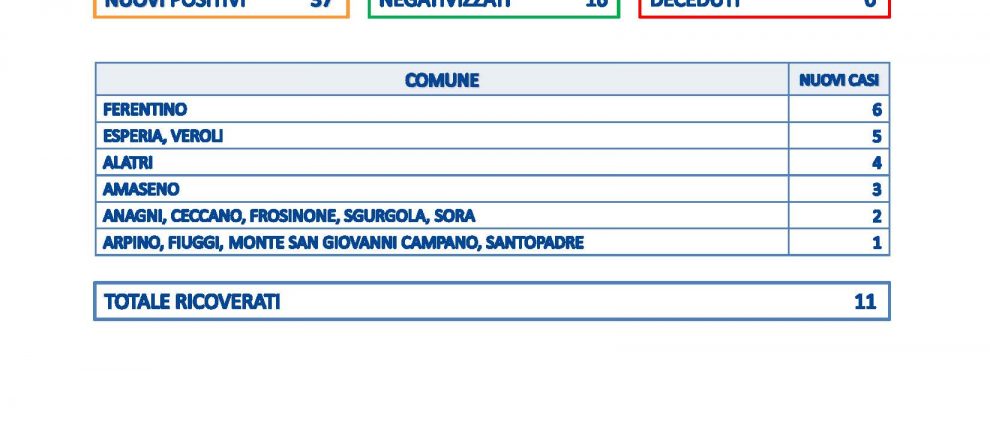 Netto rialzo dei casi positivi al Covid in provincia di Frosinone, anche se a ciò non si associa un aumento delle ospedalizzazioni, anzi i ricoverati sono due in meno. C’è anche da dire che il numero dei tamponi è molto elevato: 934, fatto questo che fissa il tasso di positività al 3,96%. Undici i ricoverati, come detto due in meno rispetto a ieri, mentre i guariti sono 16. I casi si registrano a Ferentino dove sono sei; Esperia e Veroli 5; Alatri 4 e Amaseno 3; Anagni, Ceccano, Frosinone, Sgurgola e Sora 2; Arpino, Fiuggi, Monte San Giovanni Campano e Santopadre 1.