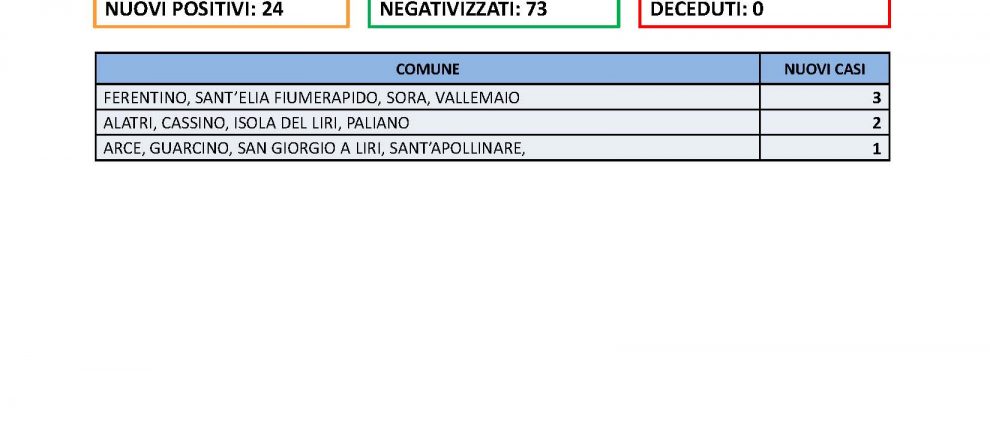 Sono 24 i nuovi casi positivi al Covid in provincia di Frosinone nelle ultime 24 ore. I tamponi effettuati lunedì sono stati 449 con un tasso di positività che si attesta al 5,46%. Sia casi e sia il tasso di positività sono in salita rispetto alla giornata di lunedì, ma in ogni caso sono sempre più i guariti (73) che i nuovi casi. Nessuna vittima è stata registrata. I nuovi positivi si registrano a: Ferentino, Sant’Elia FIumerapido, Sora e Vallemaio, che ne contano tre a testa; con due positività Alatri, Cassino, Isola del Liri e Paliano; con un solo caso Arce, Guarcino, San Giorgio a Liri e Sant’Apollinare.