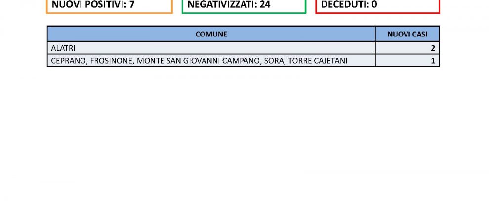 I nuovi casi positivi riguardano: la città di Alatri con due e poi con un caso i comuni di Ceprano, Frosinone, Monte San Giovanni Campano, Sora, Torre Cajetani.