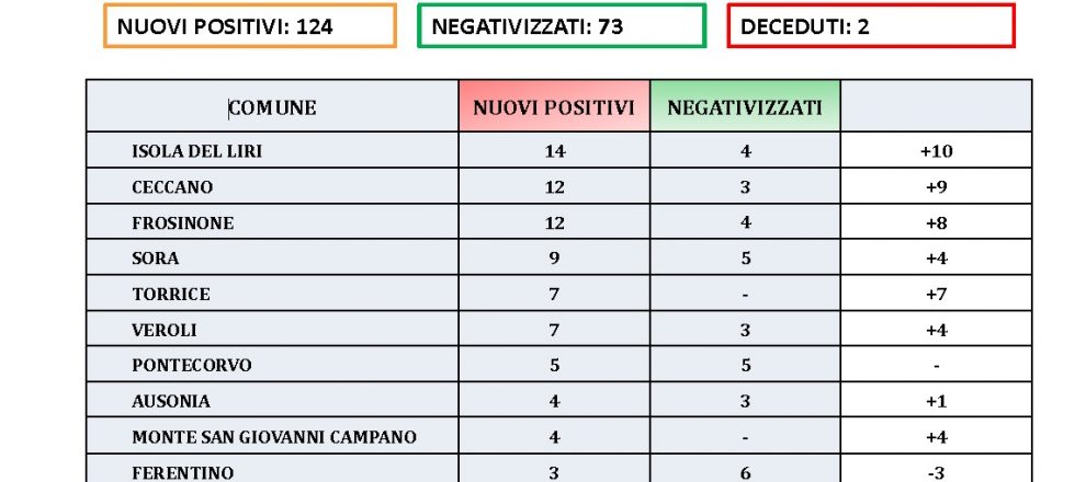Tra le città con più casi oggi spicca Isola del Liri, con 14 contagi, seguita da Frosinone e Ceccano con 12, Sora 9, Torrice e Veroli 7.