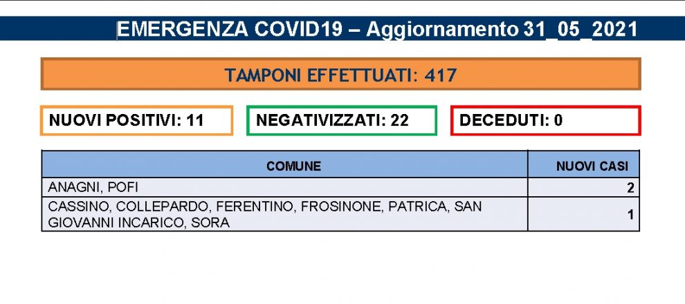 11 positivi su 417 tamponi effettuati. Sono i numeri che emergono dal bollettino della Asl di Frosinone, in cui non si registra alcuna vittima. 22 i guariti. Due i contagi che si contano a Pofi ed Anagni. 1 a Cassino, Collepardo, Ferentino, Frosinone, Patrica, San Giovanni Incarico e Sora