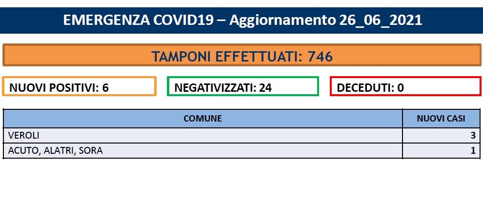 Sei positivi su 746 tamponi eseguiti: i numeri sono più o meno sempre gli stessi ormai da settimane in provincia di Frosinone. E neanche stavolta ci sono vittime. Sono 3 i contagi registrati nel comune di Veroli, 1 ad Acuto, Alatri e Sora.