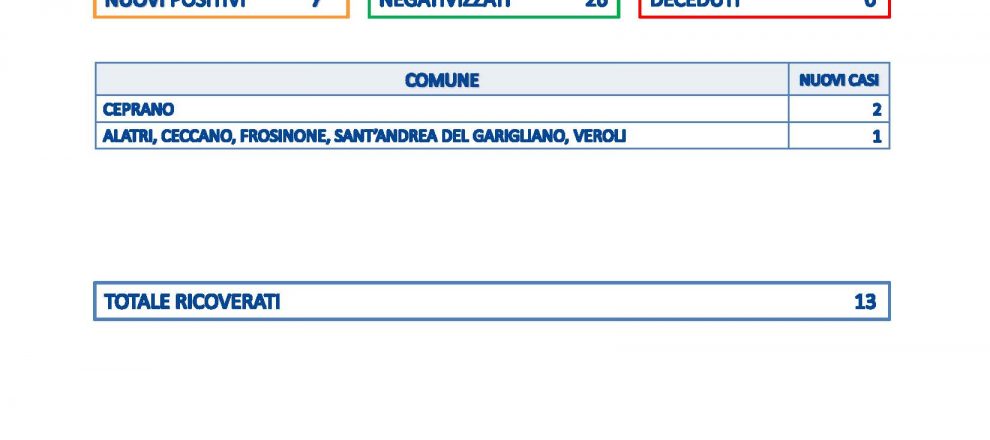 Sono sette i nuovi positivi al Covid registrati nelle ultime 24 ore su un totale di 281 tamponi processati dalla Asl di Frosinone. Il tasso di positività si attesta a 2,49%, in discesa rispetto a domenica. C’è un ricoverato in più, 13 in totale, mentre i guariti sono 26. Dei nuovi casi due se ne registrano a Ceprano, uno ad Alatri, Ceccano, Frosinone, Sant’Andrea del Garigliano e Veroli.