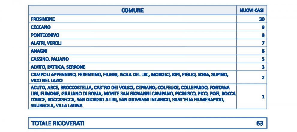 In Ciociaria sono 128 i nuovi casi Covid e si registra un decesso, si tratta di un 81enne di Frosinone. Il tasso di positività è pari all’11,71% ed i ricoverati sono 63. E’ ancora il capoluogo la città con più positivi, 30, seguita da Ceccano con 9 e Pontecorvo con 8. A 7 casi troviamo Alatri e Veroli, Anagni a 6, Cassino e Paliano a 5, Alvito, Patrica e Serrone a 3. Con uno e due casi altri 31 comuni. I guariti sono stati 73.
