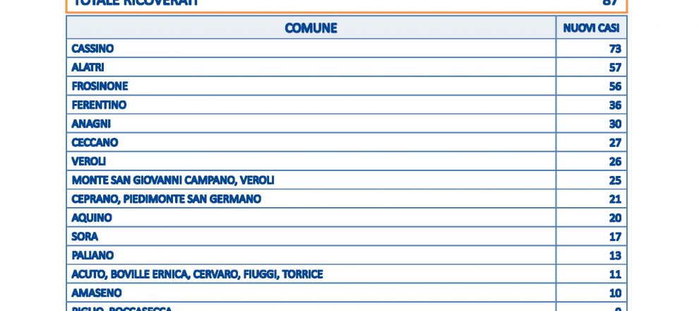 Sono 726 i nuovi positivi al Covid in provincia di Frosinone e si registra anche un decesso, si tratta di una 83enne residente a Fiuggi. Il tasso di positività è in lieve discesa al 13,78%, frutto dei 5265 tamponi effettuati. C’è un ricoverato in più, con i posti occupati che salgono a 87. E’ Cassino la città con più casi, 73, seguita da Alatri a 57 e Frosinone a 56. Poi Ferentino con 36 casi, Anagni 30 e Ceccano 27. A Veroli 26 casi, Monte San Giovanni Campano 25, Ceprano e Piedimonte San Germano 21. Ad Aquino 20 casi, Sora 17, Paliano 13; Acuto, Boville Ernica, Cervaro, Fiuggi e Torrice 11, mentre ad Amaseno 10. Da 9 a 4 casi sono 24 i comuni coinvolti. I comuni da 3 a un caso sono: