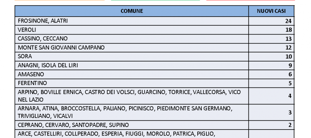 Tra i comuni a far registrare il più alto numero di positivi c’è Frosinone. 23 Alatri. 18 Veroli. 13 a Cassino e Ceccano. 12 a Monte San Giovanni Campano (alla terza settimana di zona rossa). 10 ad Anagni ed Isola del Liri.