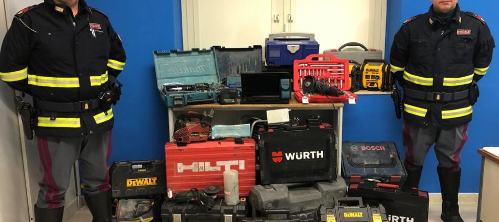 All’interno hanno rinvenuto un ingente quantitativo di attrezzi ed utensili quali trapani, avvitatori, compressori, frullini, molti dei quali custoditi dentro scatole e confezioni, oltre ad un computer portatile di cui i due non conoscevano la password di accesso.