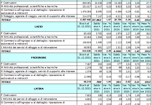 Passando alle province a sud, Frosinone e Latina confermano una più sostenuta crescita, con la più accentuata polarizzazione delle costruzioni, per un recupero delle iscrizioni complessive più contento nel frusinate rispetto ai valori del 2019. Condiviso anche il ritorno sul sentiero positivo delle attività commerciali, che però risulta più vivace in terra pontina.