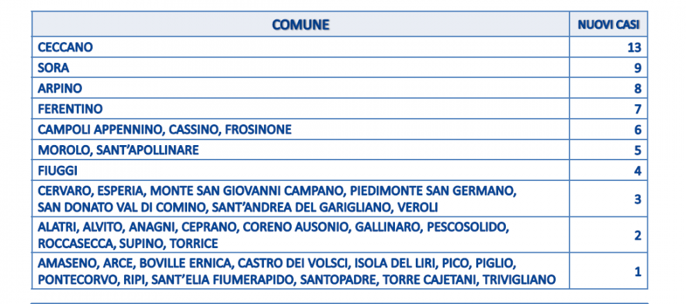 E poi altri 30 comuni della provincia di Frosinone coinvolti dal contagio al di sotto dei tre casi.