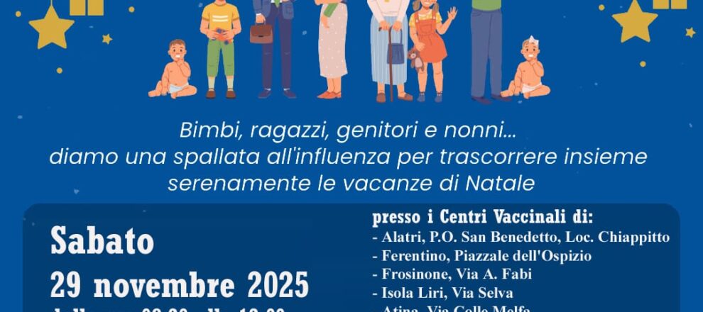 Sarà un’occasione preziosa per contrastare l’influenza e contribuire alla salute collettiva, con un gesto semplice e responsabile. Parliamo della vaccinazione anti influenzale, partita ad ottobre ma che sabato prossimo, 29 novembre, dalle ore 8.30 alle 13.00 avrà il suo Open Day Vaccinale in sette centri della provincia. La UOC Vaccinazioni della ASL di Frosinone, diretta dalla dottoressa Calenda, promuove una giornata di Open Day vaccinale. L’iniziativa è rivolta a bambini, ragazzi, genitori e nonni, con l’obiettivo di proteggere le famiglie in vista delle festività natalizie. Sabato 29 novembre 2025, dalle ore 08:30 alle 13:00, sarà possibile accedere senza prenotazione e in modalità diretta presso i Centri Vaccinali: