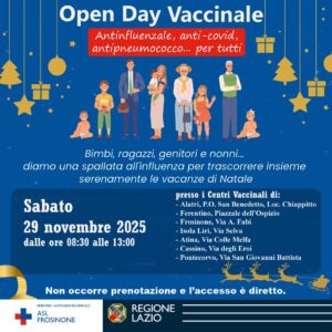 Sarà un’occasione preziosa per contrastare l’influenza e contribuire alla salute collettiva, con un gesto semplice e responsabile. Parliamo della vaccinazione anti influenzale, partita ad ottobre ma che sabato prossimo, 29 novembre, dalle ore 8.30 alle 13.00 avrà il suo Open Day Vaccinale in sette centri della provincia. La UOC Vaccinazioni della ASL di Frosinone, diretta dalla dottoressa Calenda, promuove una giornata di Open Day vaccinale. L’iniziativa è rivolta a bambini, ragazzi, genitori e nonni, con l’obiettivo di proteggere le famiglie in vista delle festività natalizie. Sabato 29 novembre 2025, dalle ore 08:30 alle 13:00, sarà possibile accedere senza prenotazione e in modalità diretta presso i Centri Vaccinali: