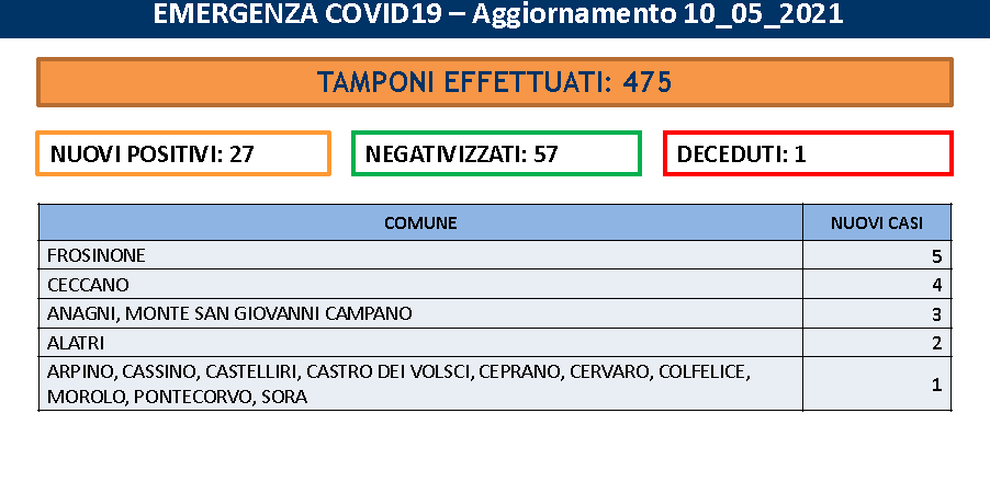 Si registra anche un decesso nelle ultime 24h di una persona residente in provincia di Frosinone: un uomo di 75 anni di Coreno Ausonio.