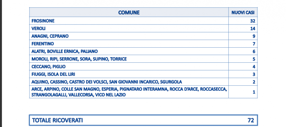 Il picco si registra a Frosinone con 32 contagi. 14 a Veroli, 9 a Anagni e Ceprano. 7 a Ferentino. Sei ad Alatri. Boville e, Paliano. 6 a Morolo, Ripi, Serrone, Sora, Supino e Torrice.